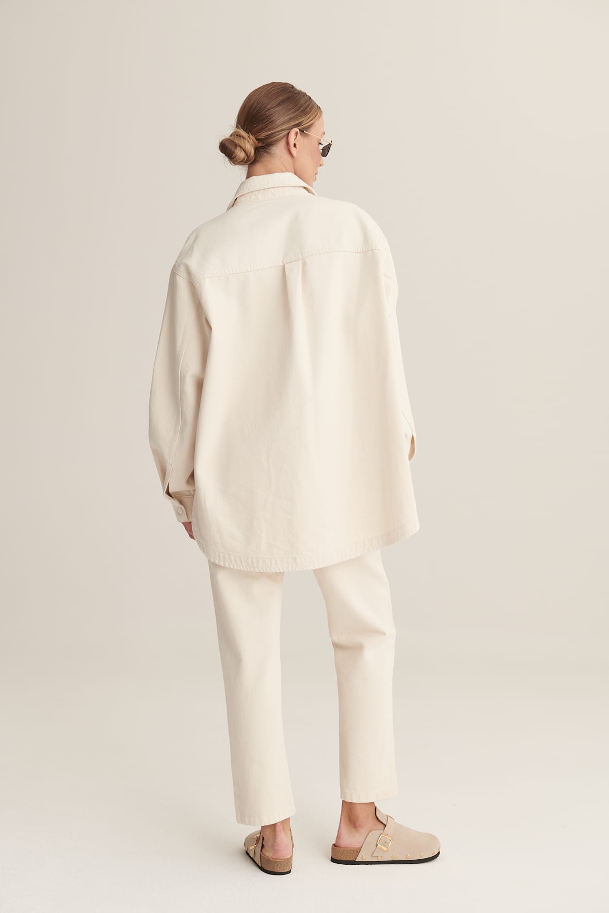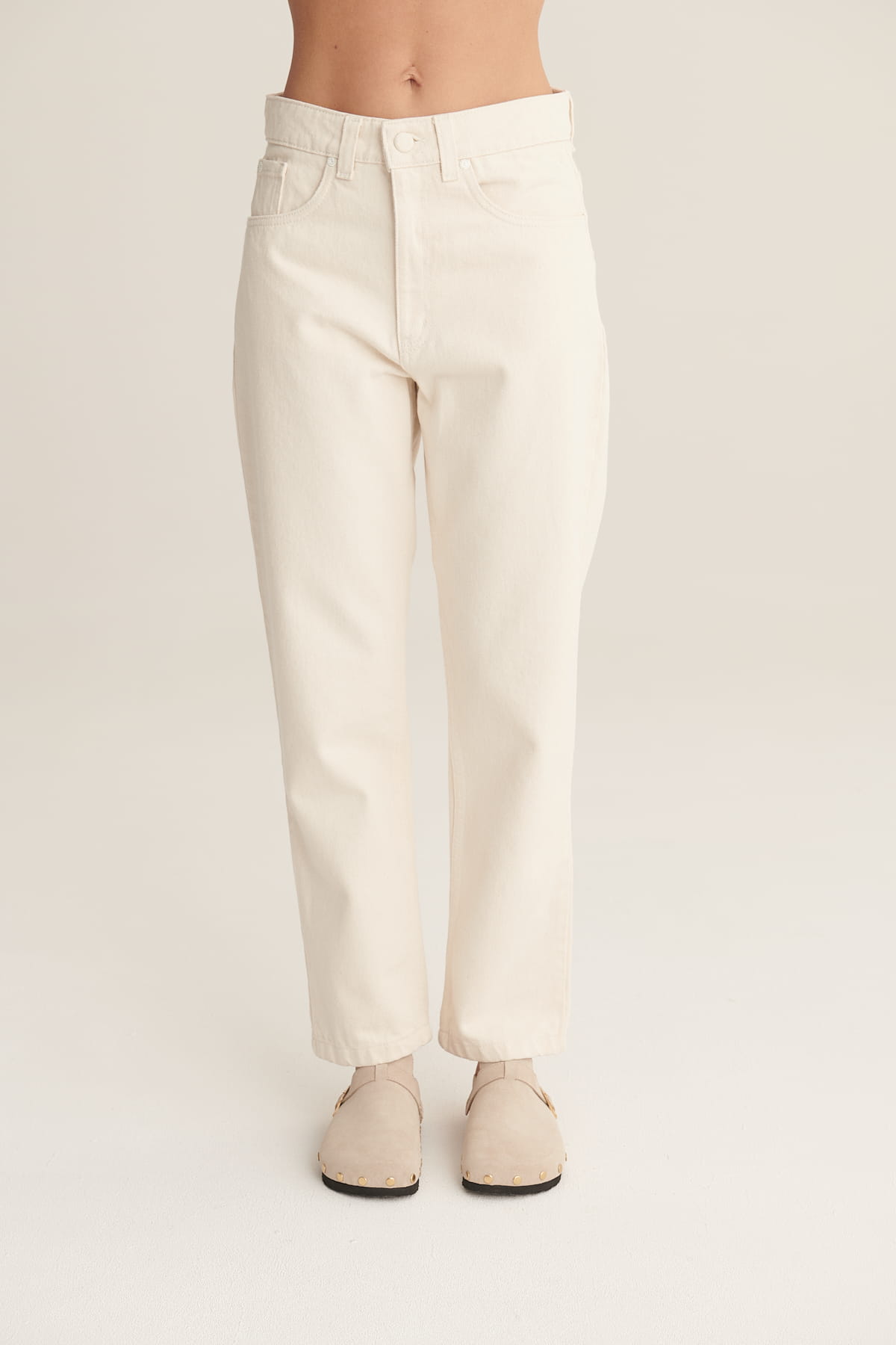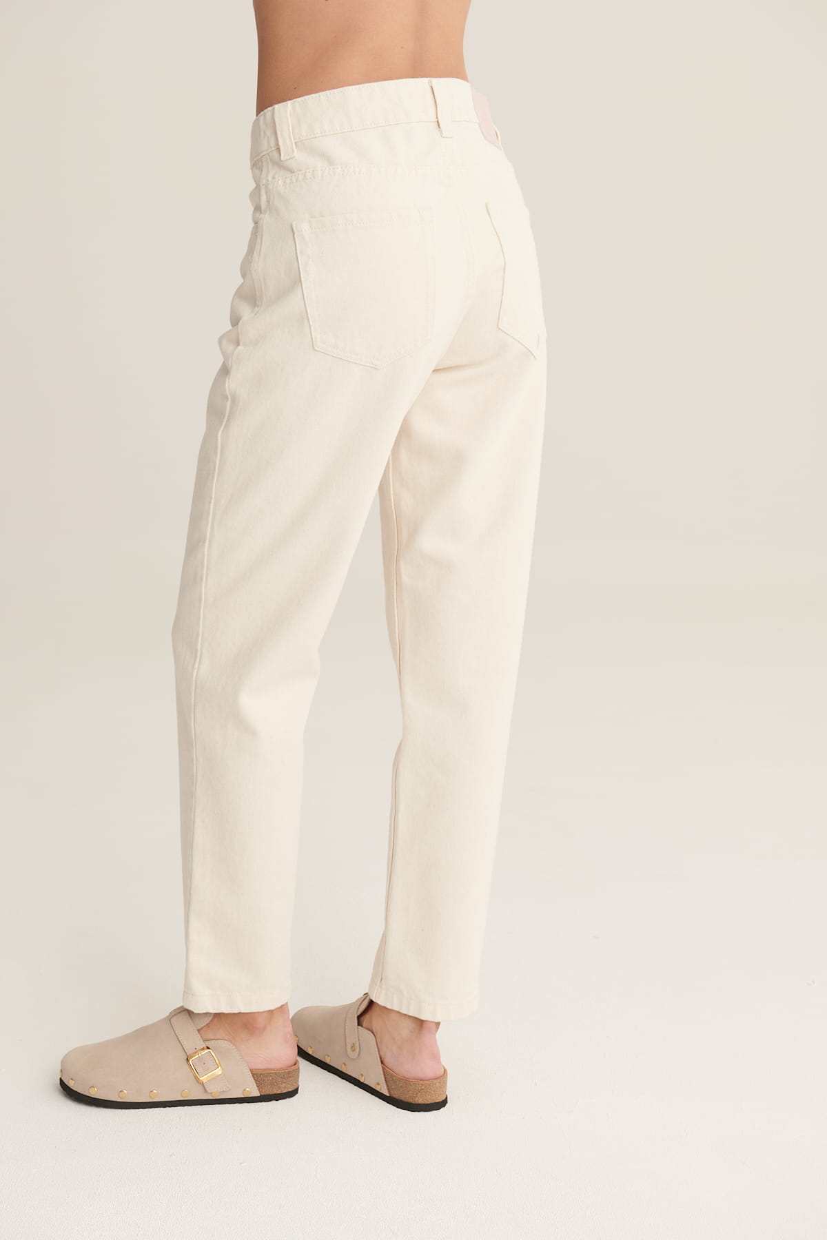 Te spodnie mom fit to klasyczny model inspirowany stylem lat 90. Charakteryzują się luźniejszym krojem w okolicy bioder i ud, z lekko zwężającymi się nogawkami. Nogawki zostały podwinięte, co nadaje im casualowego, miejskiego charakteru. Posiadają klasyczny układ kieszeni — dwie z przodu oraz kieszonki tylne.