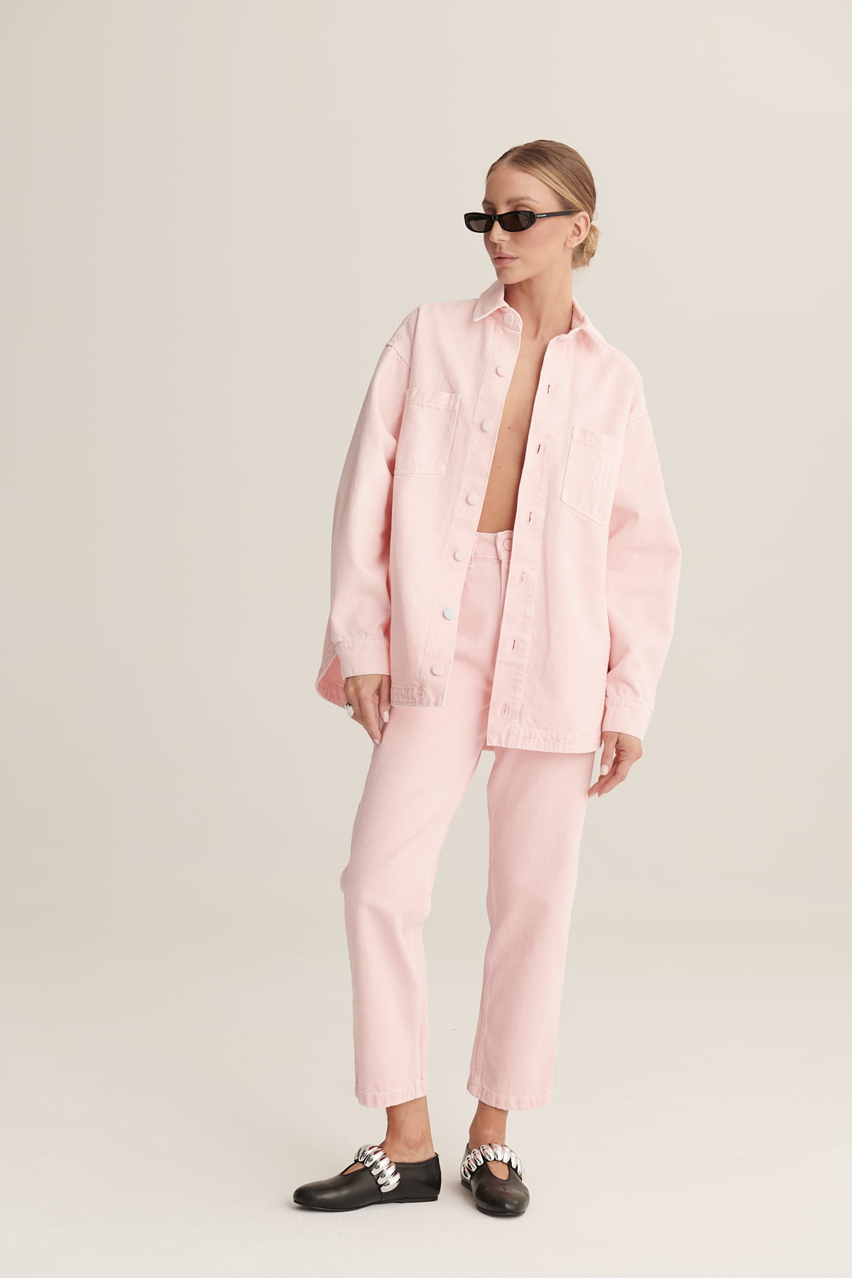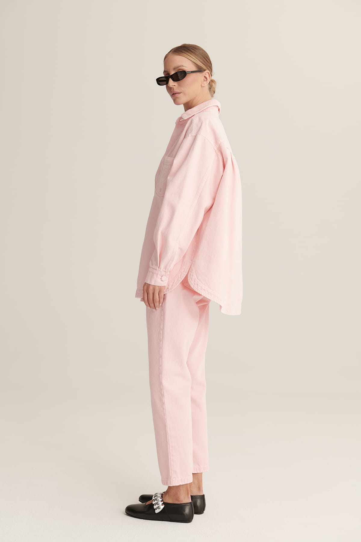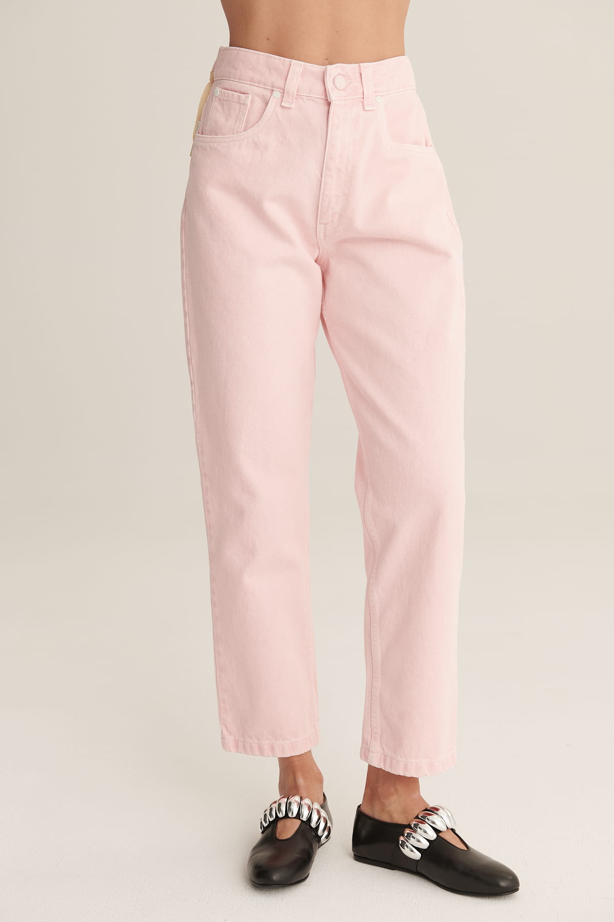 Te spodnie mom fit to klasyczny model inspirowany stylem lat 90. Charakteryzują się luźniejszym krojem w okolicy bioder i ud, z lekko zwężającymi się nogawkami. Nogawki zostały podwinięte, co nadaje im casualowego, miejskiego charakteru. Posiadają klasyczny układ kieszeni — dwie z przodu oraz kieszonki tylne.