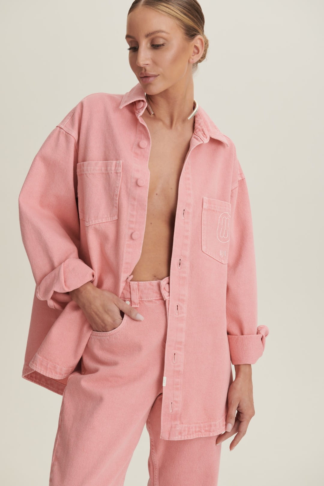 To klasyczna jeansowa koszula o swobodnym kroju, która zapewnia komfort noszenia i świetnie sprawdzi się w casualowych stylizacjach. Posiada długie rękawy zakończone mankietami zapinanymi na guziki, co pozwala na podwinięcie rękawów dla bardziej nonszalanckiego efektu. Z przodu znajdują się dwie naszywane kieszenie na piersiach, dodające koszuli charakterystycznego, lekko roboczego stylu. Zapięcie na rząd guzików na całej długości sprawia, że można nosić ją zarówno zapiętą, jak i rozpiętą, na przykład narzuconą na t-shirt. Zaokrąglony dół i nieco dłuższy fason sprawiają, że dobrze układa się na sylwetce i daje możliwość noszenia jej wpuszczonej w spodnie lub luźno na wierzchu. To ponadczasowy element garderoby, który pasuje zarówno do jeansów, jak i spódnic czy szortów.
